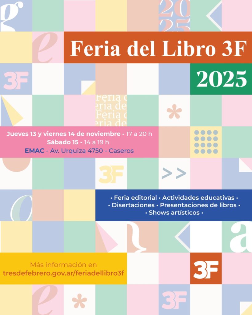 Te esperamos en la Escuela Municipal de Arte y Comunicación (Av. Urquiza 4750, Caseros) para disfrutar una nueva edición de la Feria del Libro 3F. El evento se realizará el jueves 13 y viernes 14 de 17 a 20 h y el sábado 15 de noviembre de 14 a 19 h.
