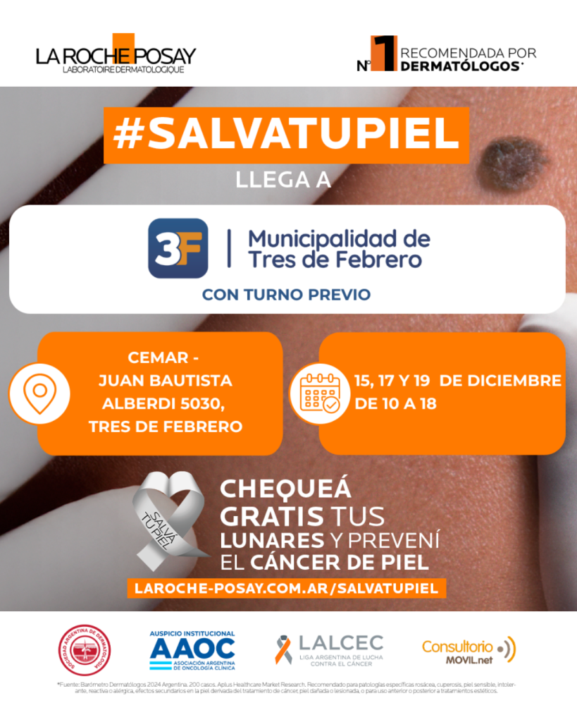 La Roche-Posay vuelve a Tres de Febrero con su campaña de concientización y prevención del cáncer de piel. Te esperamos los días 15, 17 y 19 de diciembre, en el CEMAR (Alberdi 5030) de 10 a 18 h, para ser atendido por dermatólogos profesionales que analizarán tus lunares. “Se viene el verano y la prevención es fundamental. El chequeo y los cuidados, como el protector solar, salvan vidas”, destacó el intendente Diego Valenzuela.