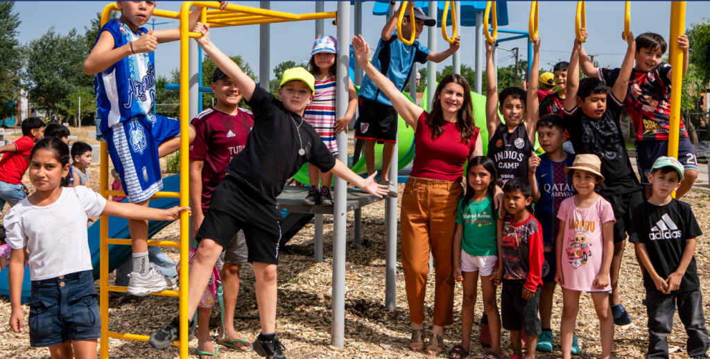 La intendenta, Mariel Fernández, acompañada por vecinas, vecinos y la secretaria de Obras y Servicios Públicos, María Giménez, inauguró la plaza del barrio La Gloria en la localidad de Moreno Norte. Este espacio renovado que antes era un basural, ahora cuenta con juegos, mobiliario, veredas, luces LED y plantas para el disfrute de las infancias y la comunidad.