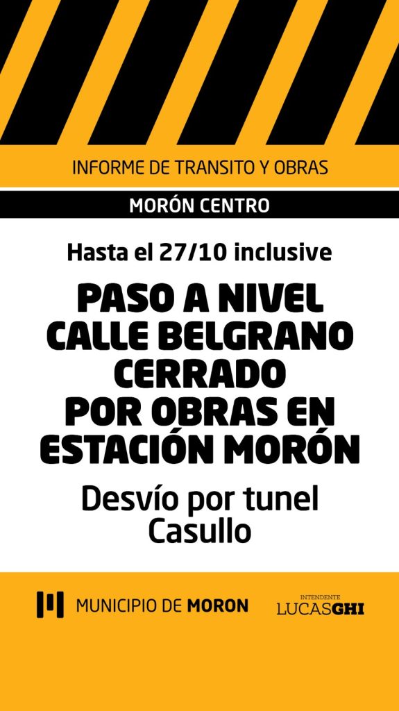 En el marco de la obra de renovación integral de la Estación Morón, desde el 6 hasta el 27 de octubre inclusive permanecerá clausurado el paso a nivel Belgrano. Los trabajos contemplan una intervención completa sobre la infraestructura ferroviaria y la calzada vehicular, con el objetivo de mejorar la seguridad, la accesibilidad y la funcionalidad de la zona.