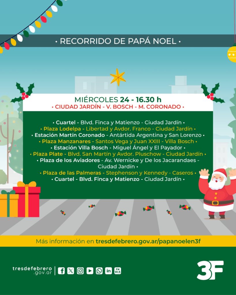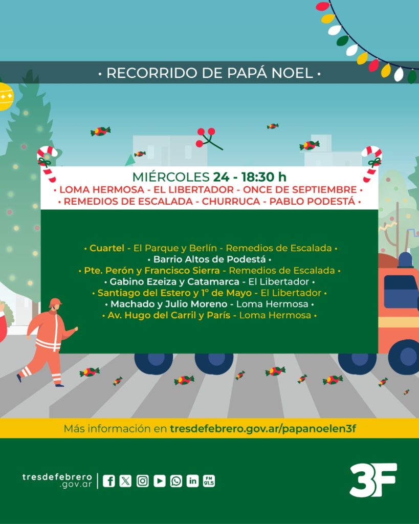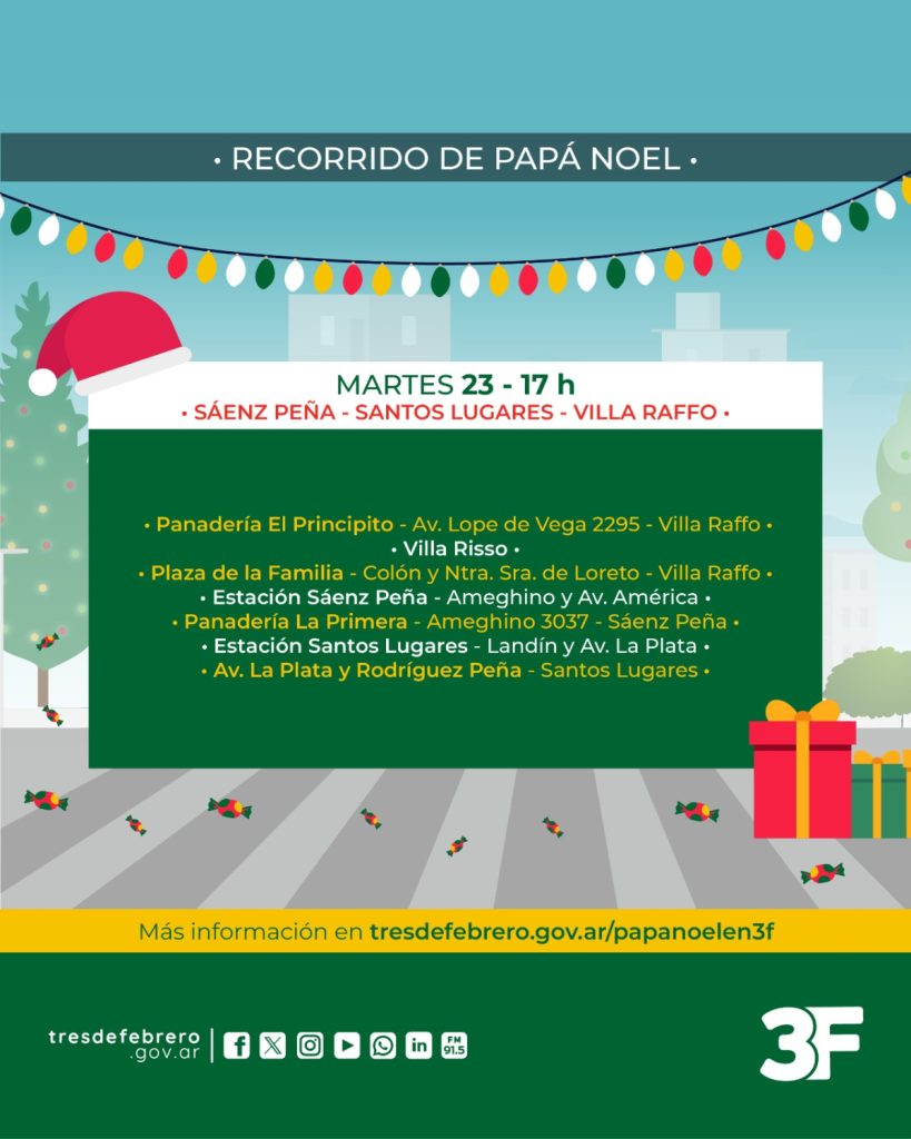 Papá Noel llega a Tres de Febrero 22 de diciembre de 2025 por infoweb FacebookTwitterPinterestWhatsApp Como cada año, Papá Noel recorrerá las diferentes barrios junto a los Bomberos Voluntarios para festejar la Navidad y que los más chicos de la familia vivan un hermoso momento junto a sus amigos. Artículo anteriorJulio Zamora acompañó la Peña Folclórica “La Breñalera” en BenavídezArtículo siguienteLa Provincia invierte $348 millones en 900 km de obras de AUBASA SIGAMOS LEYENDO La Roche-Posay vuelve a Tres de Febrero con su campaña para prevenir el cáncer de piel Tres de Febrero infoweb - 15 de diciembre de 2025 Acercate al CEMAR para chequear tus lunares y en caso de ser necesario derivarte a un especialista. La Roche-Posay vuelve a Tres de Febrero con... Bello sobre la salida de Valenzuela: “El cambio es importante, pero dentro de la gestión el equipo sigue” Tres de Febrero infoweb - 11 de diciembre de 2025 En diálogo con Infowebnoticias RADIO, el subsecretario de Atención al Vecino de Tres de Febrero habló sobre la salida del intendente, que irá a... 1,539FansMe gusta940SeguidoresSeguir43SuscriptoresSuscribirte La Provincia invierte $348 millones en 900 km de obras de AUBASA Leer más Julio Zamora acompañó la Peña Folclórica “La Breñalera” en Benavídez Leer más Más de 20.000 vecinos festejaron los 120 años de Vicente López con un gran show de luces y sin pirotecnia Leer más